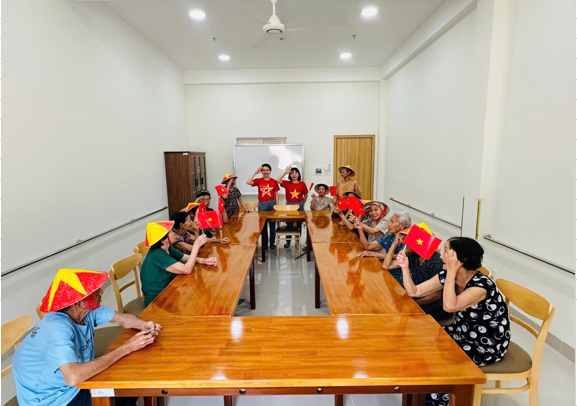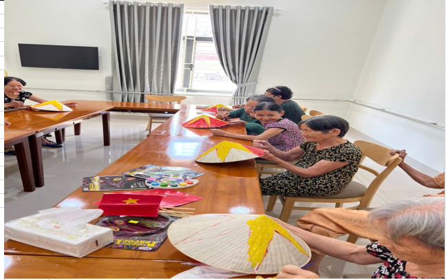 Các Cụ chơi trò chơi vẽ và tô màu ngôi sao trên nón lá nhằm khơi lại tinh thần yêu nước và tự hào Dân Tộc, các Cụ vận động đôi tay khéo léo tô thật đẹp sản phẩm, giúp các cụ phấn khích và vui vẻ hơn.
